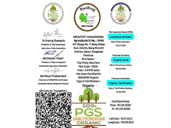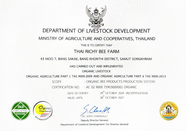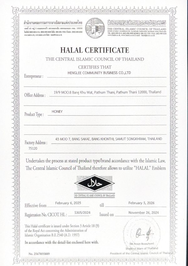 | Certified | - GMP Thai FDA -100% natural, no artificial additives, comply with AVA standard. -100% Natural Certificate by The Thai Organic Beekeeper Association - Halal Certification by The Central Islamic Committee of Thailand -Good agricultural practices for Bee Farm by Department of Livestock Development |